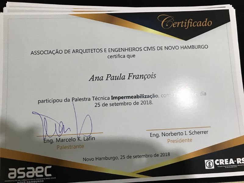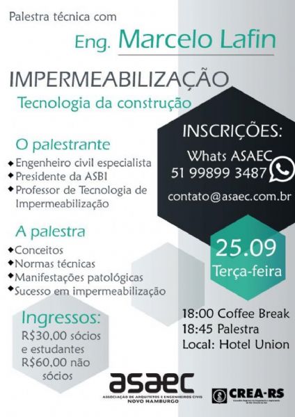 Nosso diretor executivo, Eng Marcelo Kieling Lafin, proferiu a palestra: Impermeabilização - Tecnologia da Construção na ASAEC - Associação de Arquitetos e Engenheiros Civis de Novo Hamburgo. Uma noite excelente com muita participação e troca de experiências.